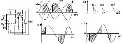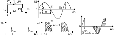 1)电阻性负载,id波形与ud波形相似,因为可控硅T与负载电阻Rd串联,所以id=id。