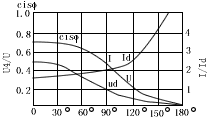 比值Ud/U,I/Id和cosψ随α的变化数值见表二,相应关系曲线见图4