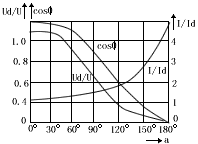 比值Ud/U、I/Id和cosψ随α的变化数值,见表一,它们相应的关系曲线,如图2所示