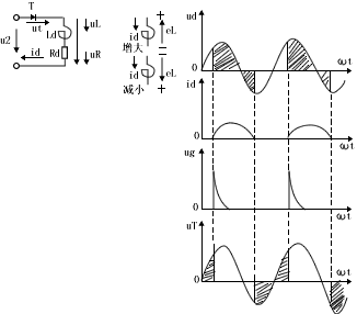2)电感具有障碍电流变化的作用可控硅T导通时,其压降uT=0,但电流id只能从零开始上升。id增加和减少时线圈Ld两端的感应电动势eL的极性变化如图示。