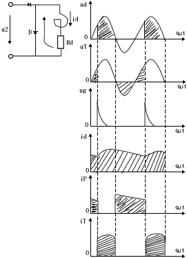 2)在电源电压u2≤0时,D的作用有点:①把电源负电压u2引到可控硅T两端,使T关断,uT=u2;②给电感电流续流,形成iD;③把负载短路,ud=0,避免ud出现负值,使负载上直流输出电压ud提高。