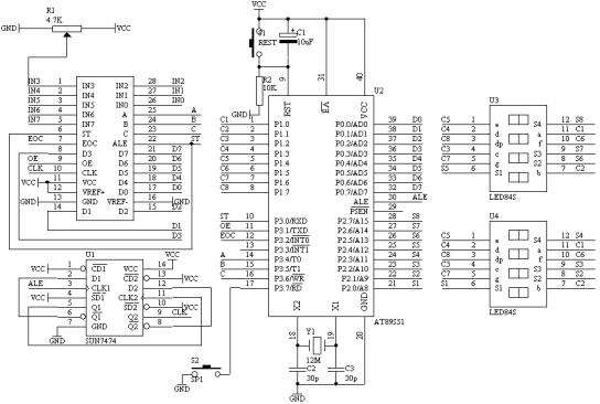 (1). 进行A/D转换时,采用查询EOC的标志信号来检测A/D转换是否完毕,若完毕则把数据通过P0端口读入,经过数据处理之后在数码管上显示。