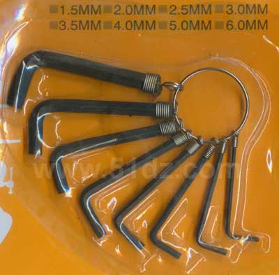 内六角搬手组合,8支8种规格分别是单位(mm):1.5, 2.0, 2.5,3.0, 3.5, 4.0 5.0,6.0。