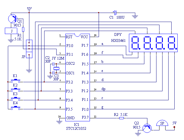 元器件及位号对照表 位号 名称 型号及规格 数量 R1、R2 电阻1/8W±5% 5.1K 2 C1 电解电容 100U 1 C2、C3 瓷片电容 30 2 K1、K2、K3、K4 轻触开关 4 Q1、Q2 三极管 9015 2 SP 蜂鸣器 1 20脚IC座 1 IC 单片机芯片 STC12C1052 1 继电器 JRC-21F 4100 1 JY 晶振 12MHz 1 DPY 数码管 HX03461 1 JP 插针 4针 1 电路板 1