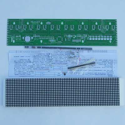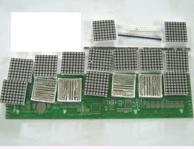 - 3.75mm点阵4字副套件:包含16个74HC595、16个高亮红色8*8点阵、电路板、贴片电容、连接线、固定压簧等元件, 组装成LED点阵副板(副板无需安装MCU、DS1302和三极管等相关元件),副板一定要与主板配套才能使用,否则没有主板用不了。用户必须有相当的电子基础和单片机基础,本站不提供功能完善的商业化程序(价格太高,一般用户都买不起),但是会提供一个可以正确显示汉字的例子程序给大家,因此,不懂电子和单片机的朋友请不要购买套件,请购买本站的成品板(价格高20-40%),或者建议购买本站带外框支架的成品(需订货,价格会再高20-40%)!