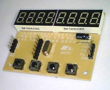本板特点:除了8位LED数码显示,板上还有6根IO口完全对外开放,可以由用户任意扩展发挥,这6根IO口中有通信中断、计数中断、外部中断,可以外接串行通信、无线接收模块、无线发射模块,红外接收头、红处发射管、红外管、光敏电阻、光电耦合器、霍尔传感器、电阻电容、分频电路、振荡电路等等等等,思想有多广,应用就有多广!并且,板上还预留了一个16PIN的COMS贴片IC的安装位置,可以组成分频器、振荡器、放大器等!不会的就从电子基础技术开始学习。