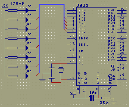 按照这个图的接法,当1脚是高电平时,LED不亮,只有1脚是低电平时,LED才发亮。因此要1脚我们要能够控制,也就是说,我们要能够让1引脚按要求变为高或低电平。即然我们要控制1脚,就得给它起个名字,总不能就叫它一脚吧?叫它什么名字呢?设计51芯片的INTEL公司已经起好了,就叫它P1.0,这是规定,不可以由我们来更改。