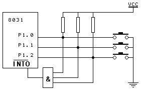 2、采用中断方式:如图4所示。各个按键都接到一个与非上,当有任何一个按键按下时,都会使与门输出为低电平,从而引起单片机的中断,它的好处是不用在主程序中不断地循环查询,如果有键按下,单片机再去做相应的处理。