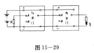 图15-29的电路实际是自动夜明灯(发光二极管)的电路。天黑时光敏电阻的阴值很大,第一个非门的输入瑞A与低电位间相当于开路,是高电位,输出瑞和第二个非门的输入端是低电位,第二个非门的输出端是高电位,夜明灯自动发光。天亮时光敏电阻的阻值减少,第一个非门的输人端A同低电位间相当于接通,夜明灯自动熄灭。